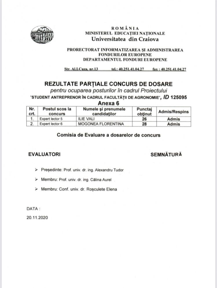 Rezultate partiale concurs din cadrul proiectului POCU (Program Operațional Capital Uman), POCU/864/6/21 cu titlul "STUDENT ANTREPRENOR ÎN CADRUL FACULTĂȚII DE AGRONOMIE”, ID PROIECT:POCU/380/6/13/125095 (aici).